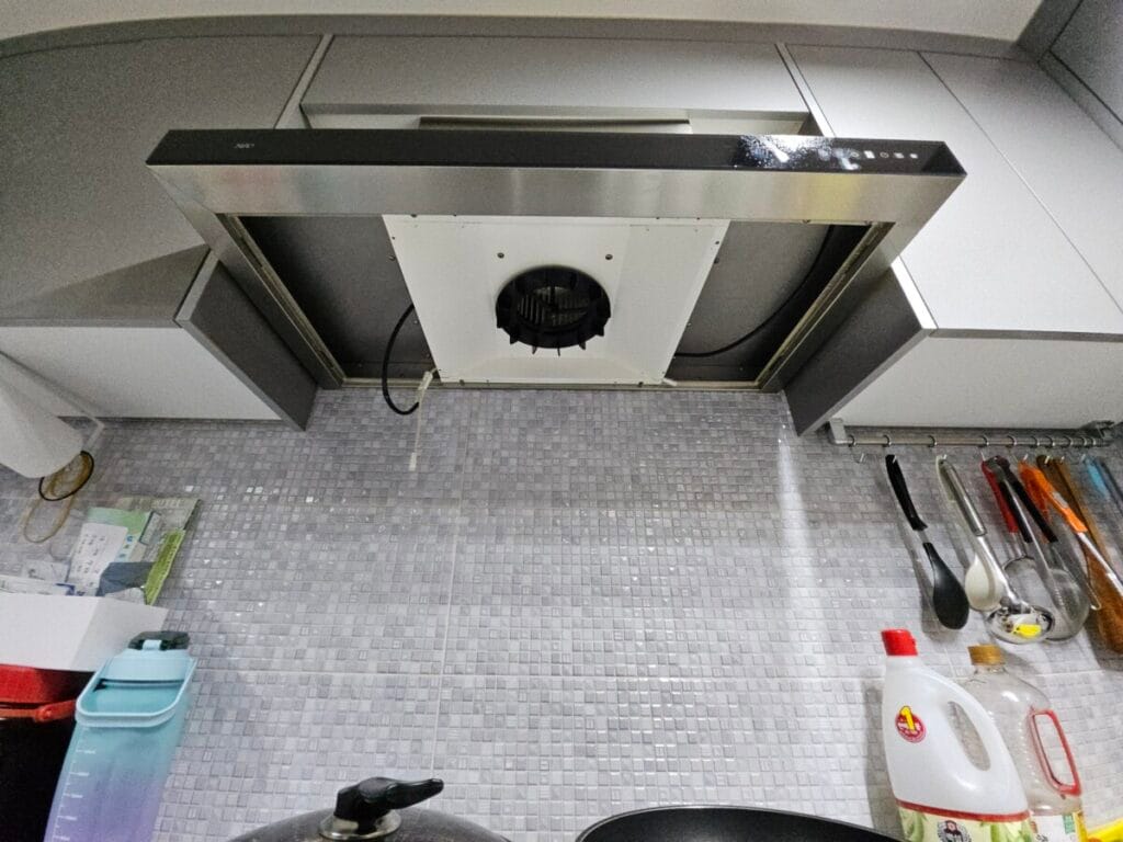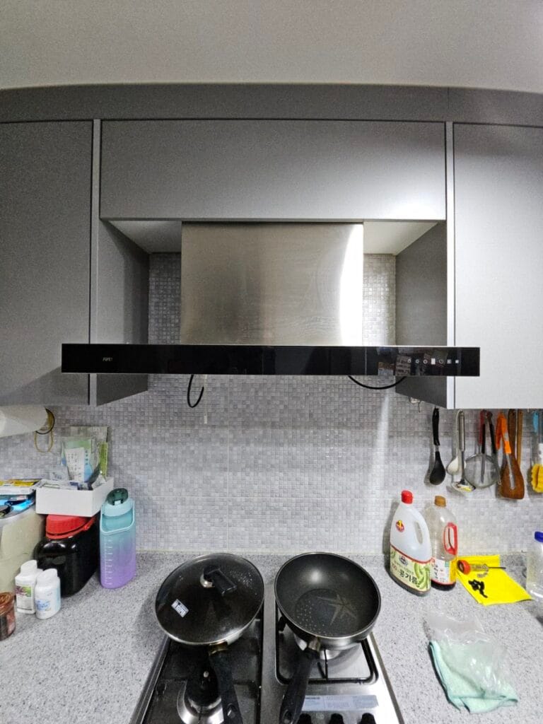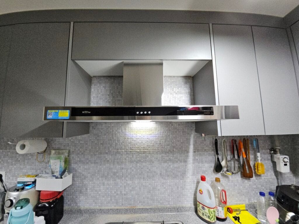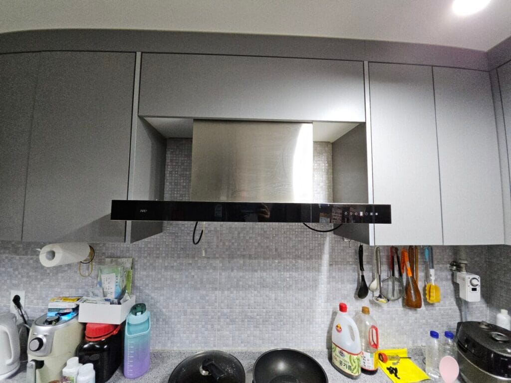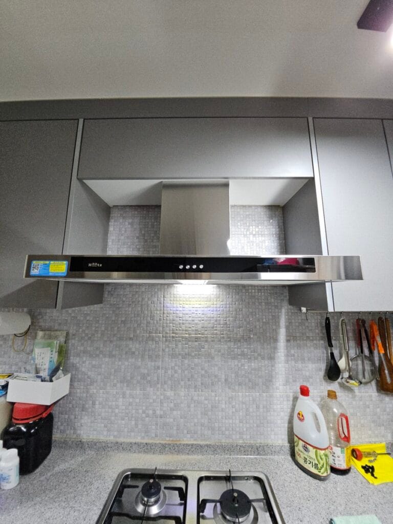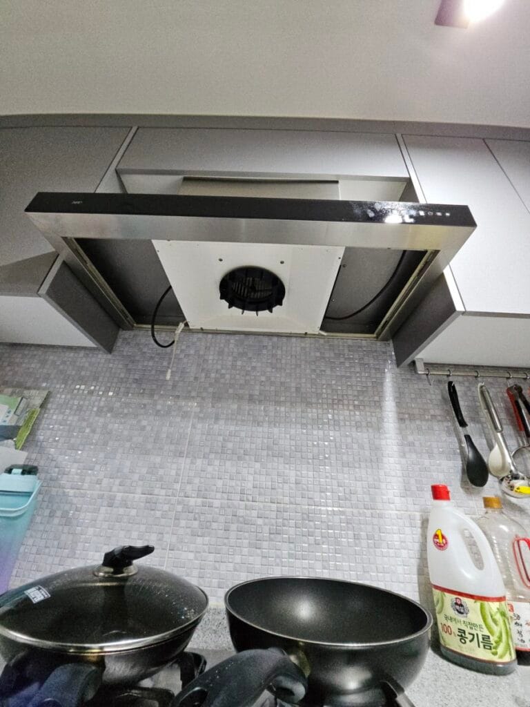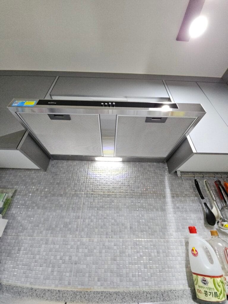 주방 후드 교체로 주방이 훨씬 밝아지고 깔끔해진 느낌입니다. 고객님도 만족해하셨네요.