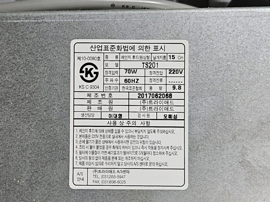앞서 말씀드렸듯이 후드의 종류와 타입이 다양한 만큼 제조사도 다양합니다. 설치된 후드는 트라이애드 TRIAD라는 회사의 제품입니다.