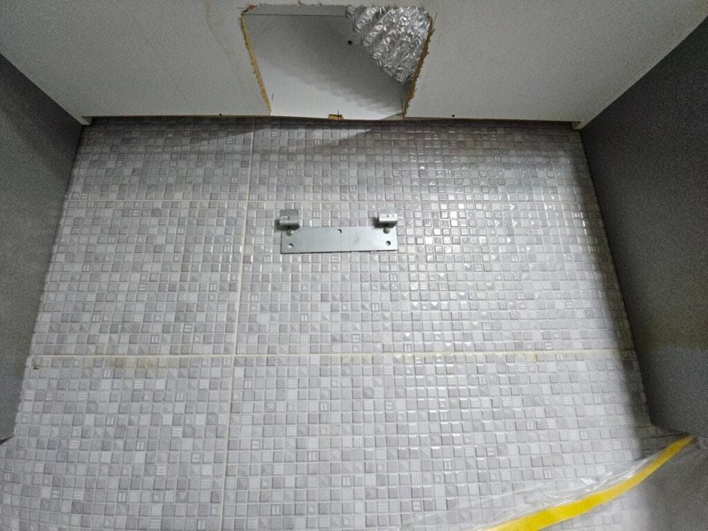 기존 후드를 철거한 모습입니다. 후드를 고정하기 위한 브라켓이 벽에 설치되어 있습니다. 이 브라켓은 모든 제품에 호환되지 않기 때문에 철거해야 합니다.