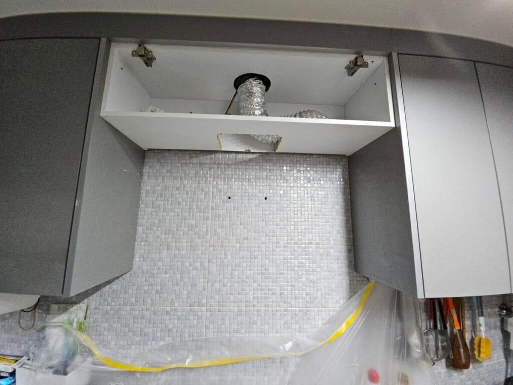 후드 위에 이렇게 상부장이 설치되어 있는데 상부장 문짝을 해체한 모습입니다. 후드에서 빨아들인 공기와 냄새가 저 주름배관을 통해 밖으로 빠져나가는 것입니다.