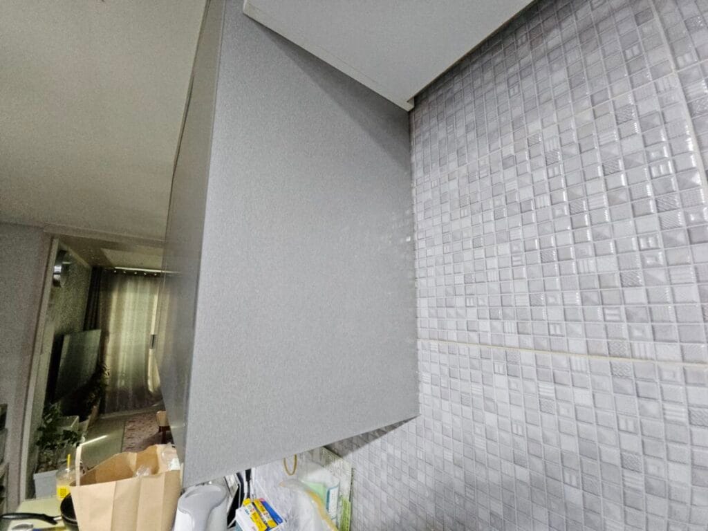 기름때 청소가 완료되었습니다. 벽타일과 상부장이 깔끔해졌습니다.