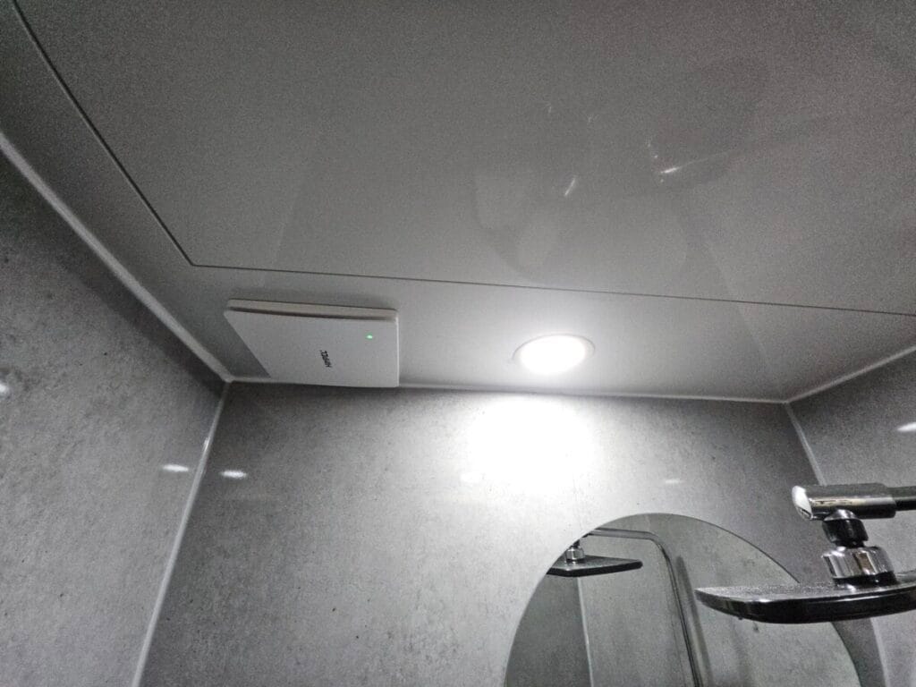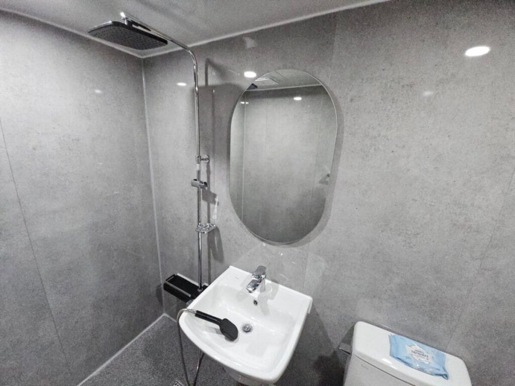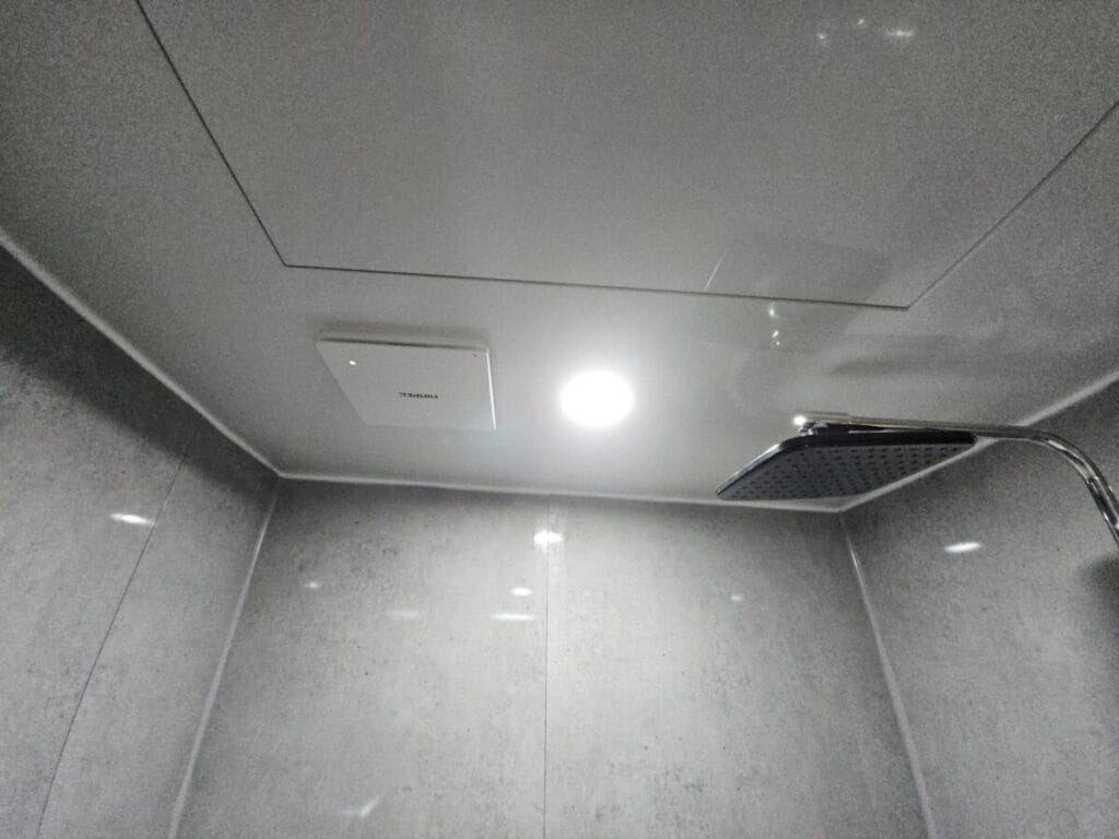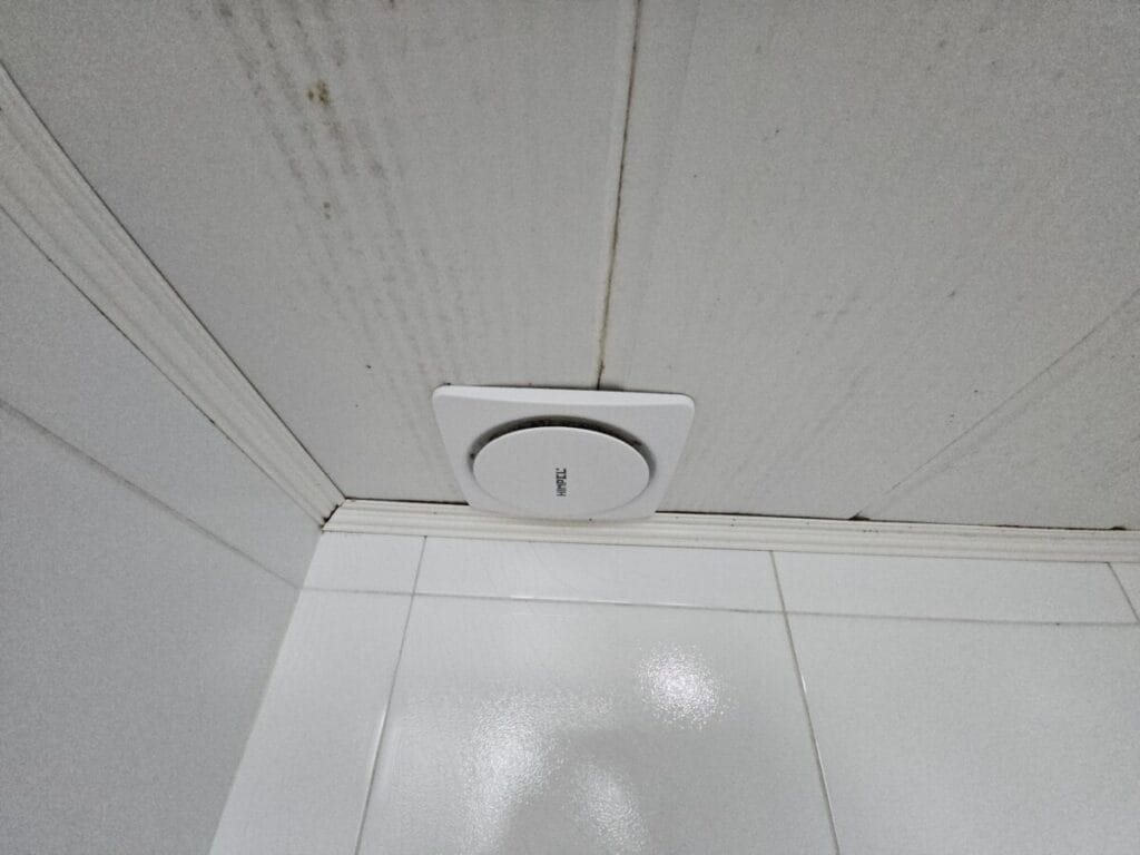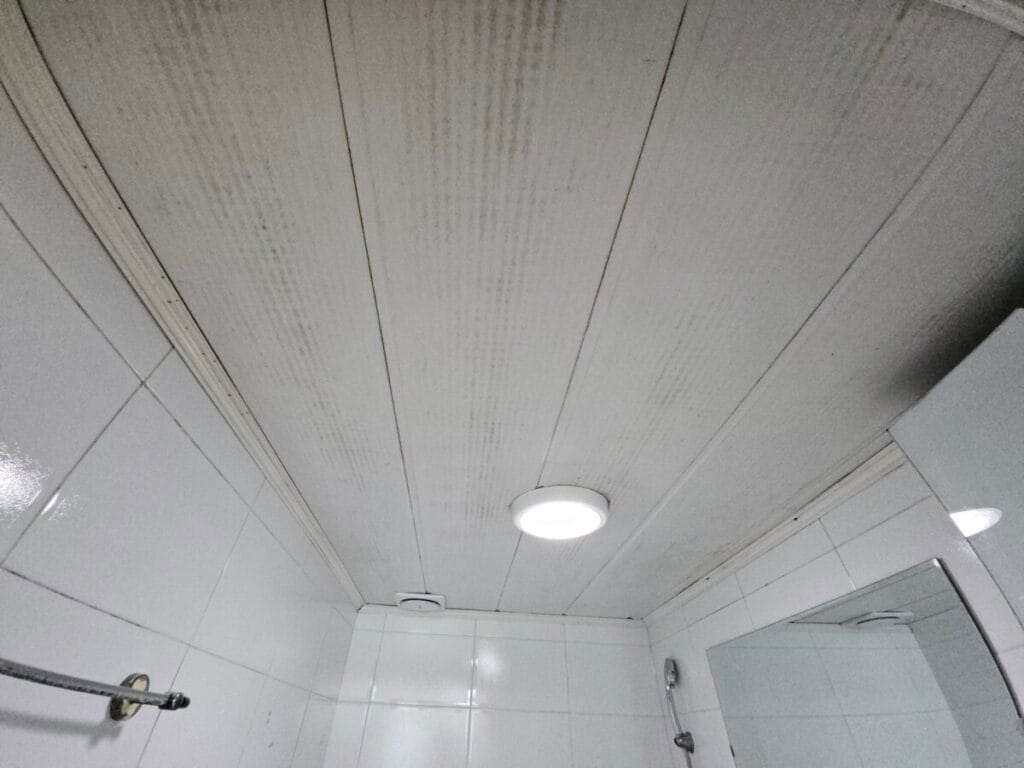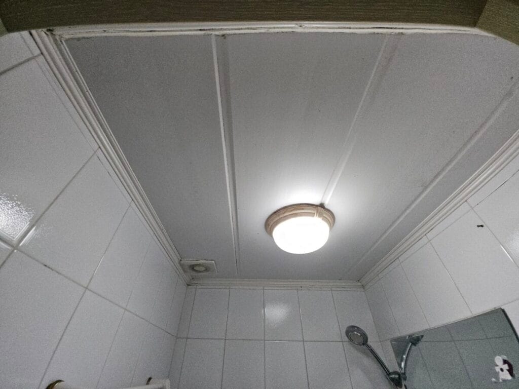 천장재와 환풍기, 조명까지 설치가 완료되었습니다. 실리콘 마감까지 깔끔하게 마무리되었습니다.