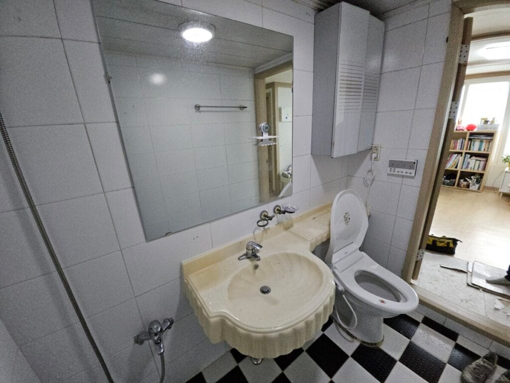 집 평형이 20평대 이상이면 대부분 화장실이 2개가 있습니다. 이번에 방문한 고객님 댁도 화장실이 2개였는데요. 화장실 2개 모두 크기가 크지 않은 구조입니다. 거주 중에 화장실 리모델링 공사를 해야 하는데 이런 상황에서는 한 군데 화장실을 먼저 작업하고 작업이 끝난 후에 다른 화장실 작업을 해야 합니다. 고객님이 거주 중에 화장실을 사용해야 하기 때문이죠. 그래서 공사 기간은 좀 더 길어질 수 있습니다.