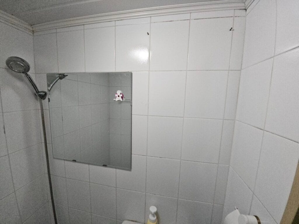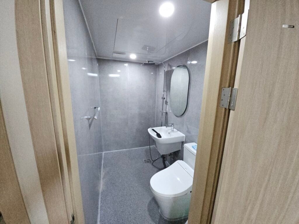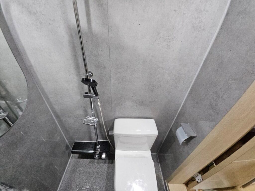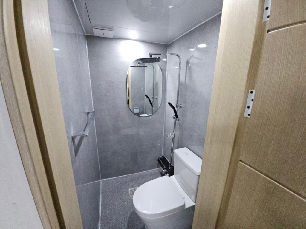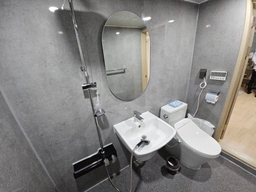 안방 화장실도 작업이 완료되었습니다. 안방 화장실은 크기가 훨씬 협소하기 때문에 천장재, 환풍기, 조명, 변기, 샤워기, 거울, 악세서리만 설치하였습니다. 안방 화장실은 크기가 작지만 심플하고 깔끔하게 마무리되었습니다.