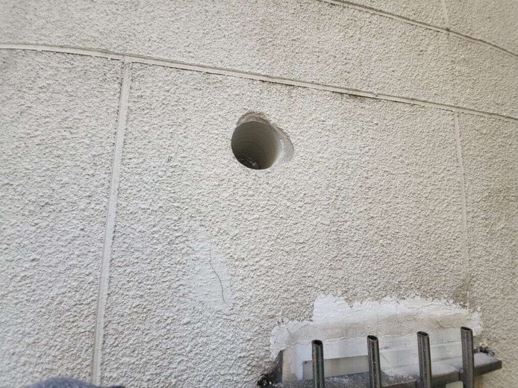 환풍구 타공 작업이 완료되었습니다. 깔끔하게 구멍이 뚫렸습니다. 외벽은 콘크리트이기 때문에 쉽게 뚫리지 않습니다. 그래서 전용 장비를 사용해야 하고 소음과 먼지도 많이 납니다. 홈편한세상은 전용 장비를 사용하여 먼지도 최대한 나지 않게 작업하고 있습니다. 소음은 크기 때문에 이웃 분들께 먼저 양해를 구하는 것이 좋겠습니다.