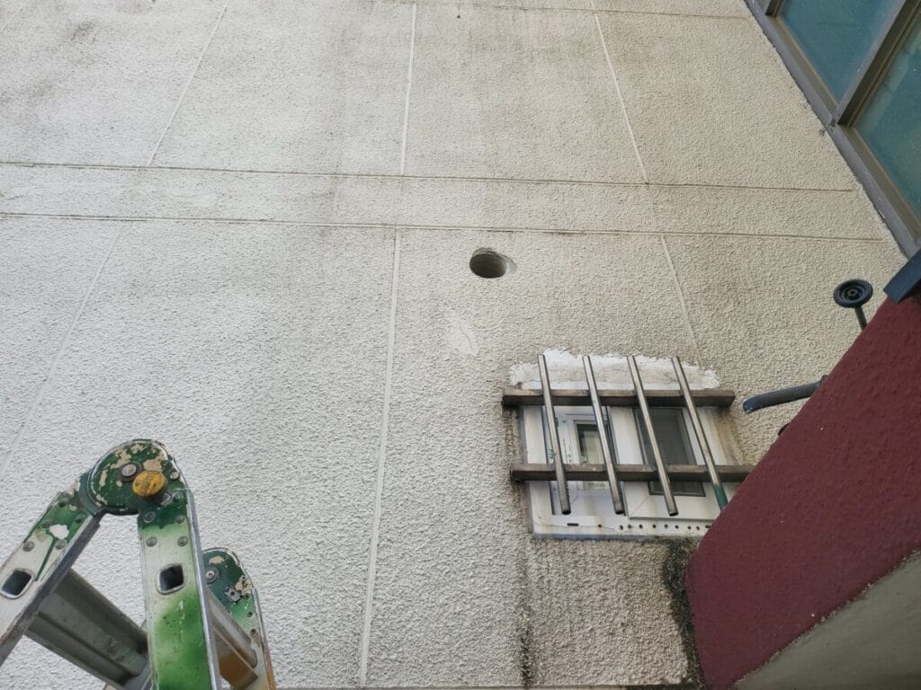 타공된 콘크리트 조각은 외벽 아래로 떨어지는 경우는 거의 없지만 잔해들이 떨어질 수 있으니 안전에 유의해서 작업하고 있습니다.