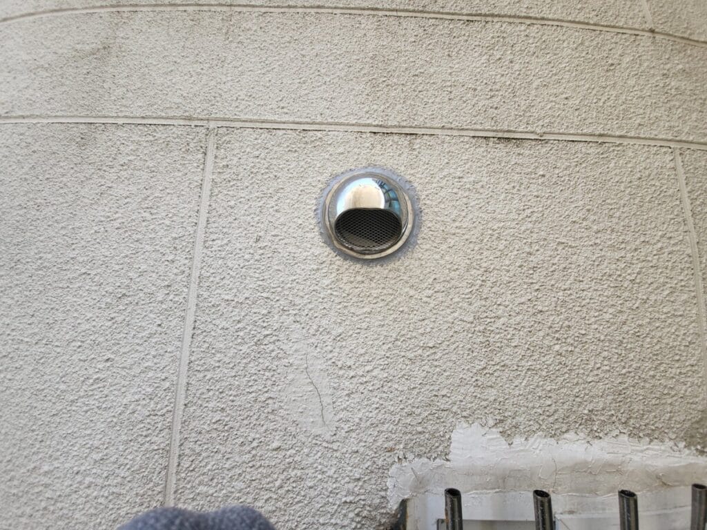 구멍을 뚫은 외벽에 모습입니다. 단순히 타공만 하면 이 구멍으로 빗물이 들어올 수도 있고 벌레들이 들어올 수도 있어서 캡을 설치해야 합니다.